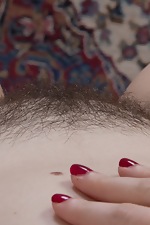 Kelly Morgan smiles and is clothing her new dress. Her dress and red underwear come off and she has a very hairy pussy under those panties. She lays back with a smile again and shows us her hairy twat.